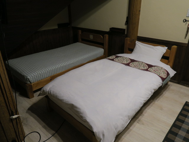 部屋は山小屋風の三角空間で広くて快適。照明はやや暗めなのでカップルにはちょうど良いかもしれない。暖房が少々弱い感じがあった。