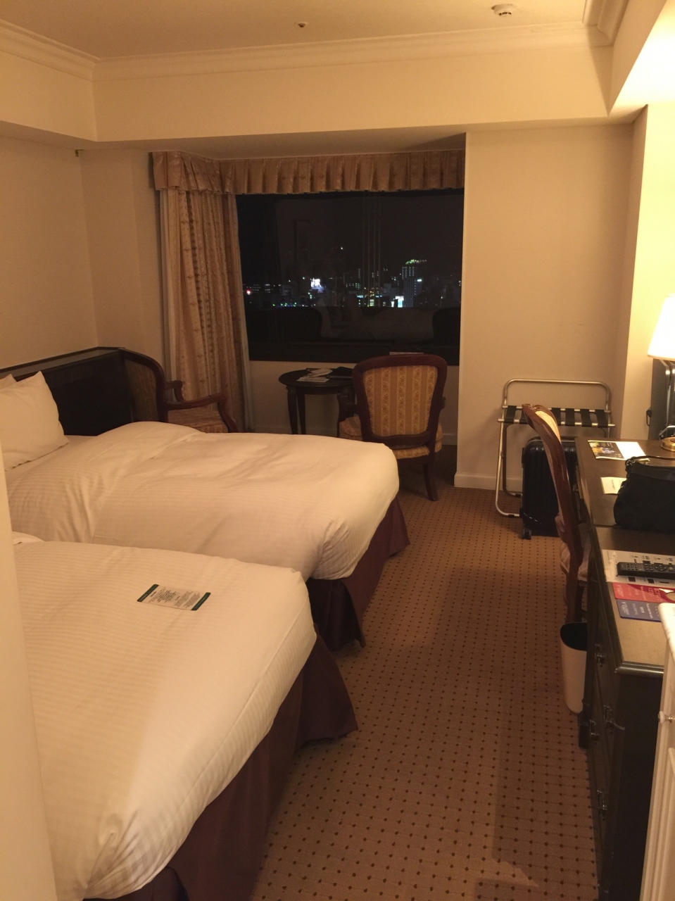 部屋はスタンダードツイン、ベッドはセミダブルサイズ×2、かためのクッション、快適に眠れました。