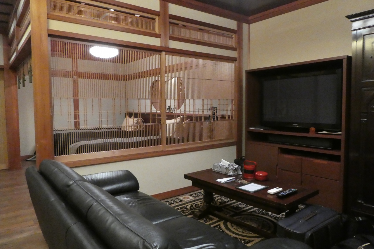選んだ部屋は、「温泉リビング」と銘打った半露天風呂を備えた広い空間があり、掛け流しの温泉が常時湯船に注がれていて、これが本当に快適だった。