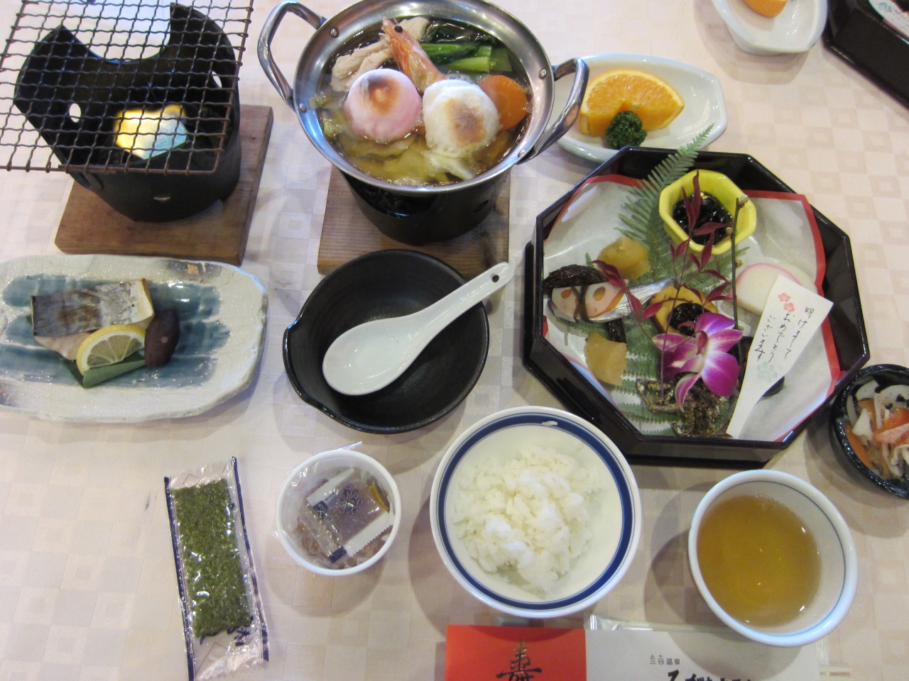 食事は大広間です。衝立があるといいのですが、年末なので無理。基本は和定食ですが、ご飯、味噌汁、おばんざい、デザート類はバイキングになります。年末なので料金的には良かった。