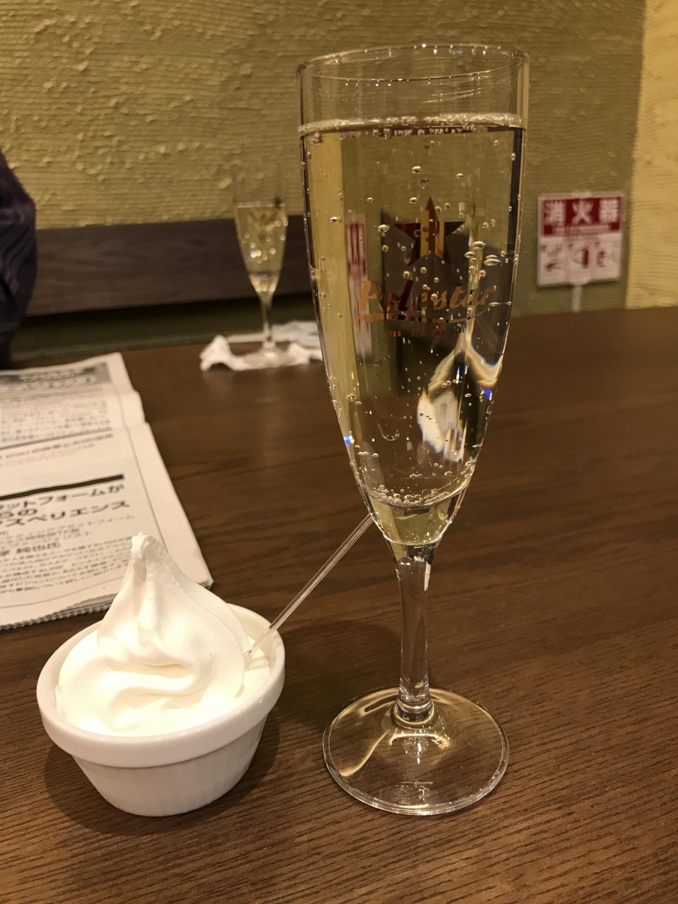8時くらいにチェックインし、ロビーで10時まで、ソフトクリームと、スパークリングワインと、コーヒーが飲み放題でしたので、まず、ソフトクリームとスパークリングワインをごちそうになり、お部屋に行き、温泉に入り、湯上りにまた、ソフトクリームとスパークリングワインをごちそうになりました。美味しかった!この、サービス最高です。