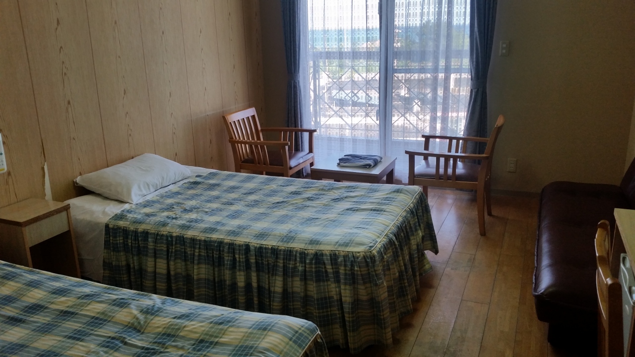 仕事で宿泊しました。ツインをシングルユースさせてもらいました。木目調というと聞こえはいいですが、ちょっと古臭かったです。でも、かび臭くはなかったです。ホテルの近くには、いろいろなお店があって便利でした。