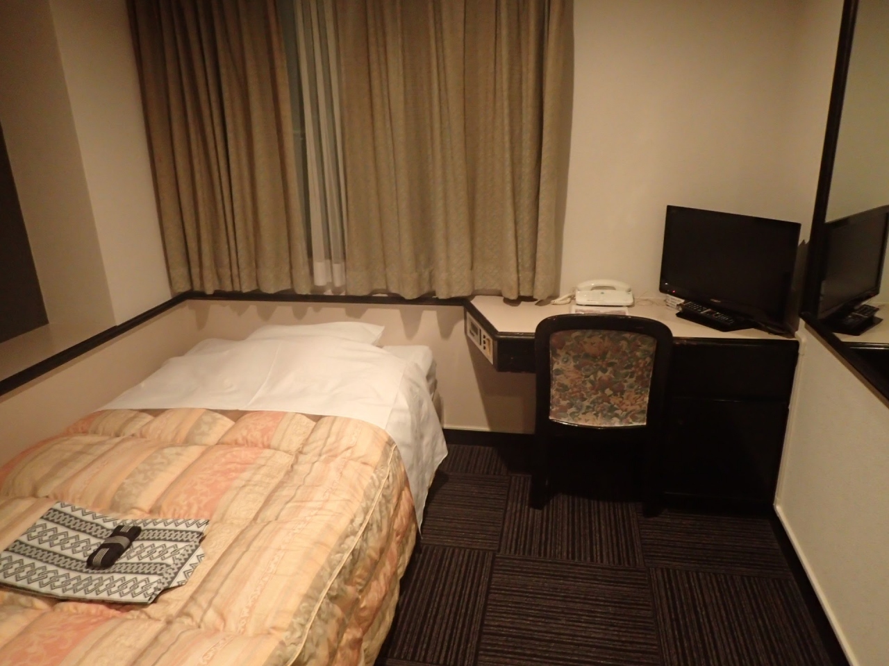 シングルルームは13㎡とちょっと狭い。バスルームもユニットバス。バスタブは少し古いタイプで狭いが、大浴場があるので、湯につかるならそちらへ。”大”浴場というほど大きくはないが、足を伸ばせるので良しとしましょう。