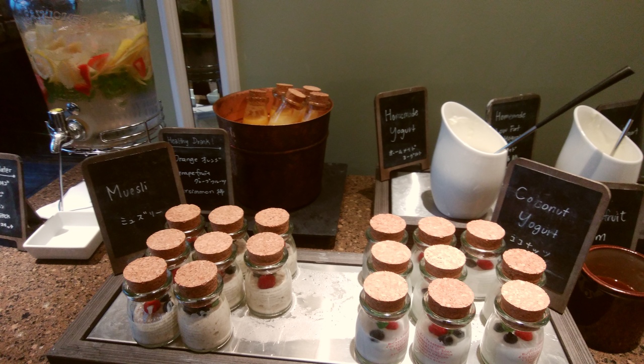 サーモン、ハム類、チーズ、サラダ、ヨーグルト、スープ、パン類、温かい料理、フルーツなど。パン類は、シンプルなハード系のパンだけでなく、カラフルで色々な種類のスイーツ系パンが並んでいました。ディスプレイの仕方もオシャレで美味しそう。選ぶのが難しくて、すごく迷ってしまいました。外国人ゲストが多いためか、グラノーラやシリアル類、ヨーグルトや牛乳も数種類用意されていました。