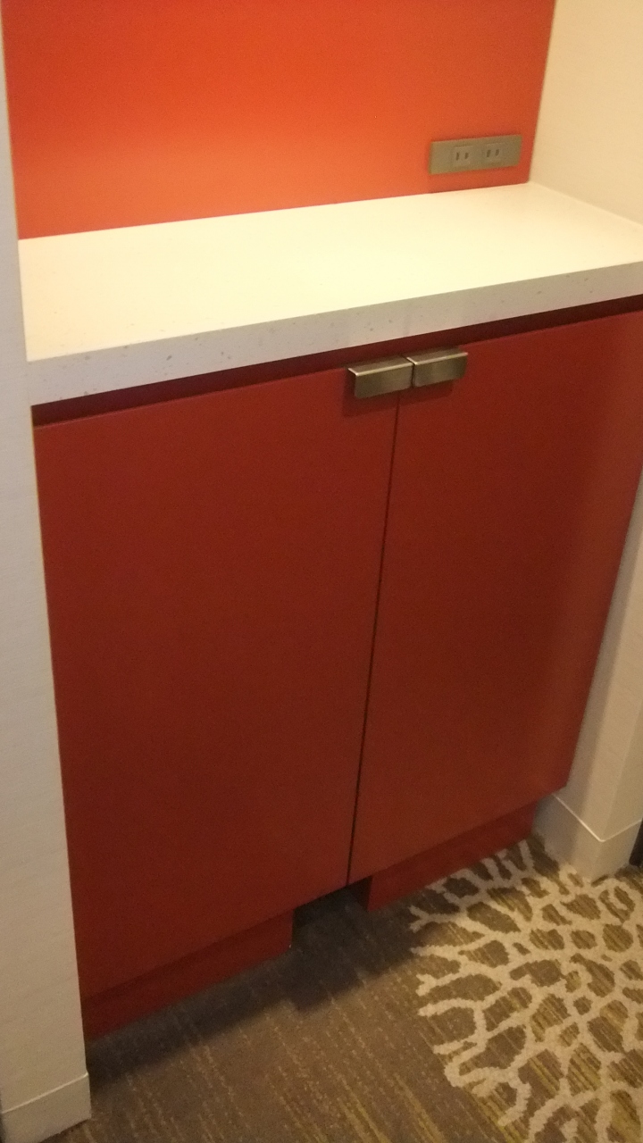 外人の女性スタッフが「どこでも空いているところに置いてください」という。