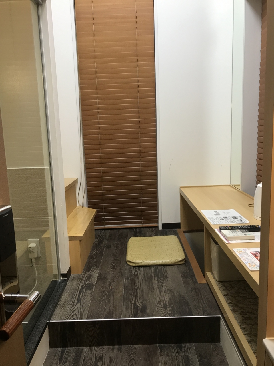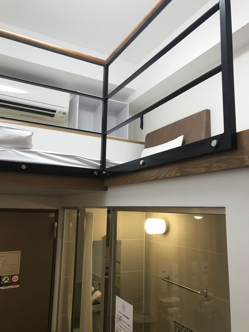 部屋はロフト形式になっており1階がシャワー・トイレ・テーブル。2階部分がベッドになっています。経費削減をして宿泊代をお安くというコンセプトの為、公式サイトではアメニティはなしとなっていましたが、ボクのプランは2泊分のアメニティをいただきました。(アメニティは確認されてください)