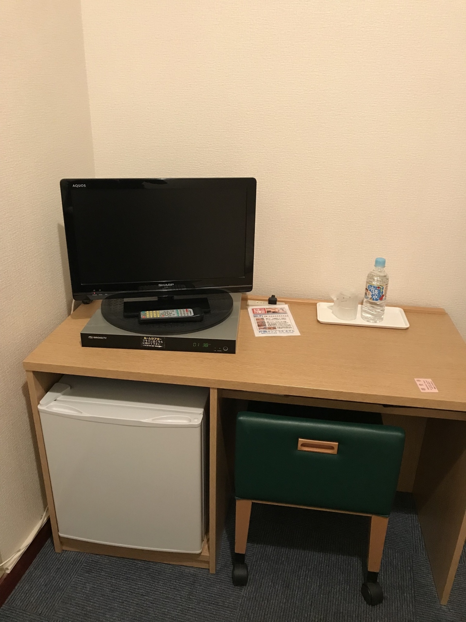 部屋にはペットボトルの水や浴衣、スリッパなど必要なものはそろっています。