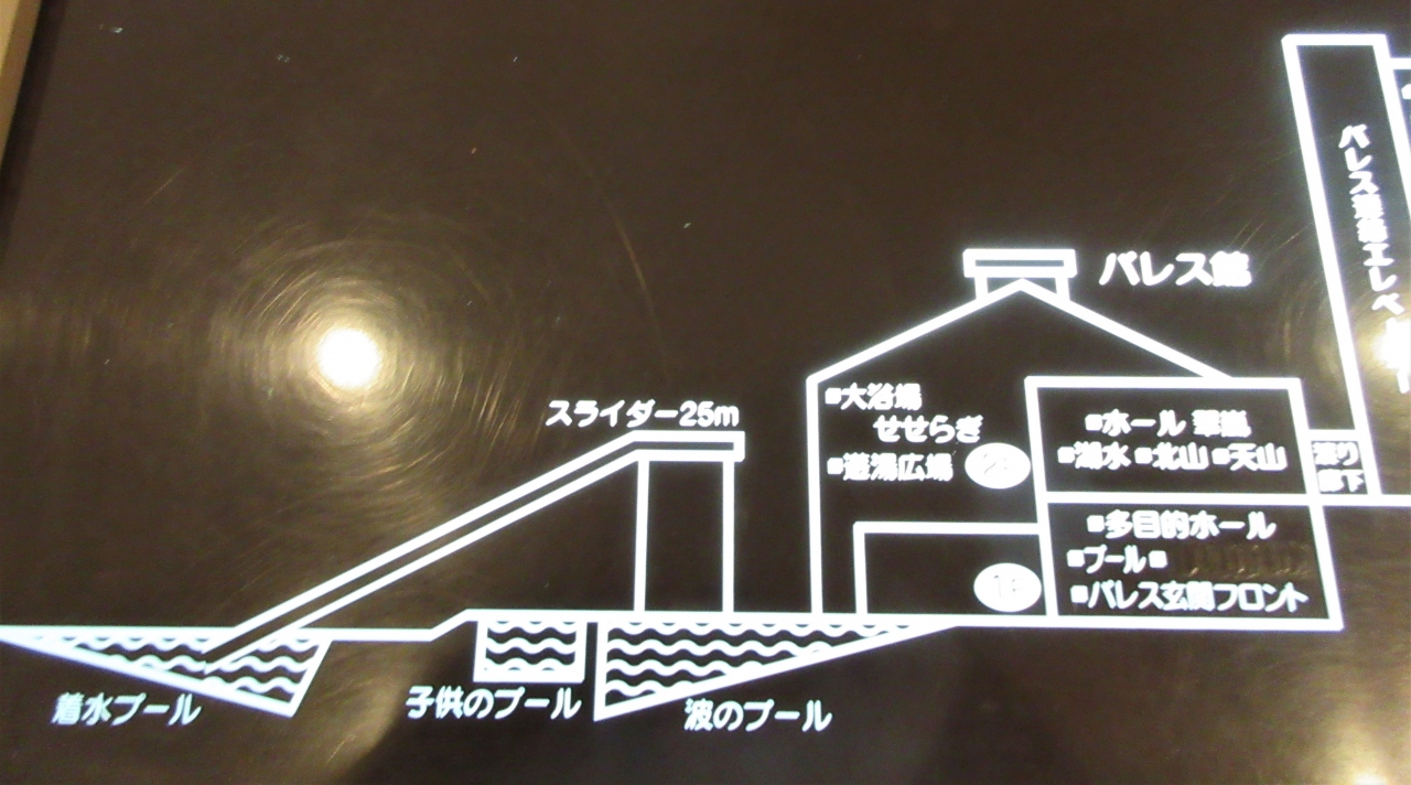 ホテルは傾斜を利用しているのでロビーから大浴場に行くまでは長い廊下を歩き、エレベーターで下に降りた場所です。