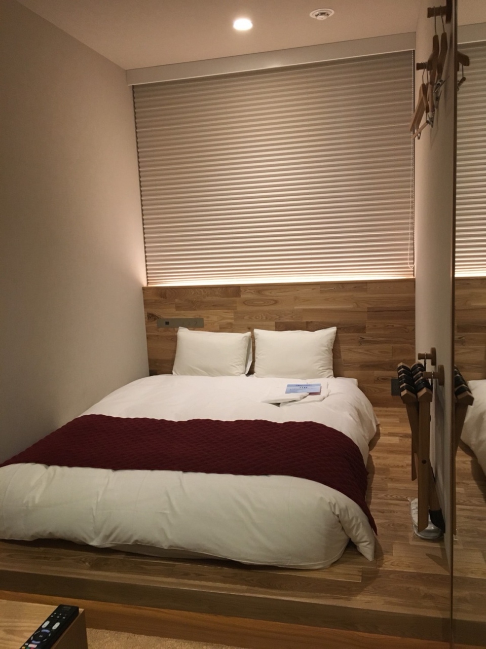 お部屋は色々なタイプがあるようですが、私は上から2番目の階の一番奥の部屋でした。決して広くない部屋ですが、家具の配置や間接照明がおしゃれなので狭さは気になりません。写真の通りいい部屋です。クローゼットがないのがやや残念でした。