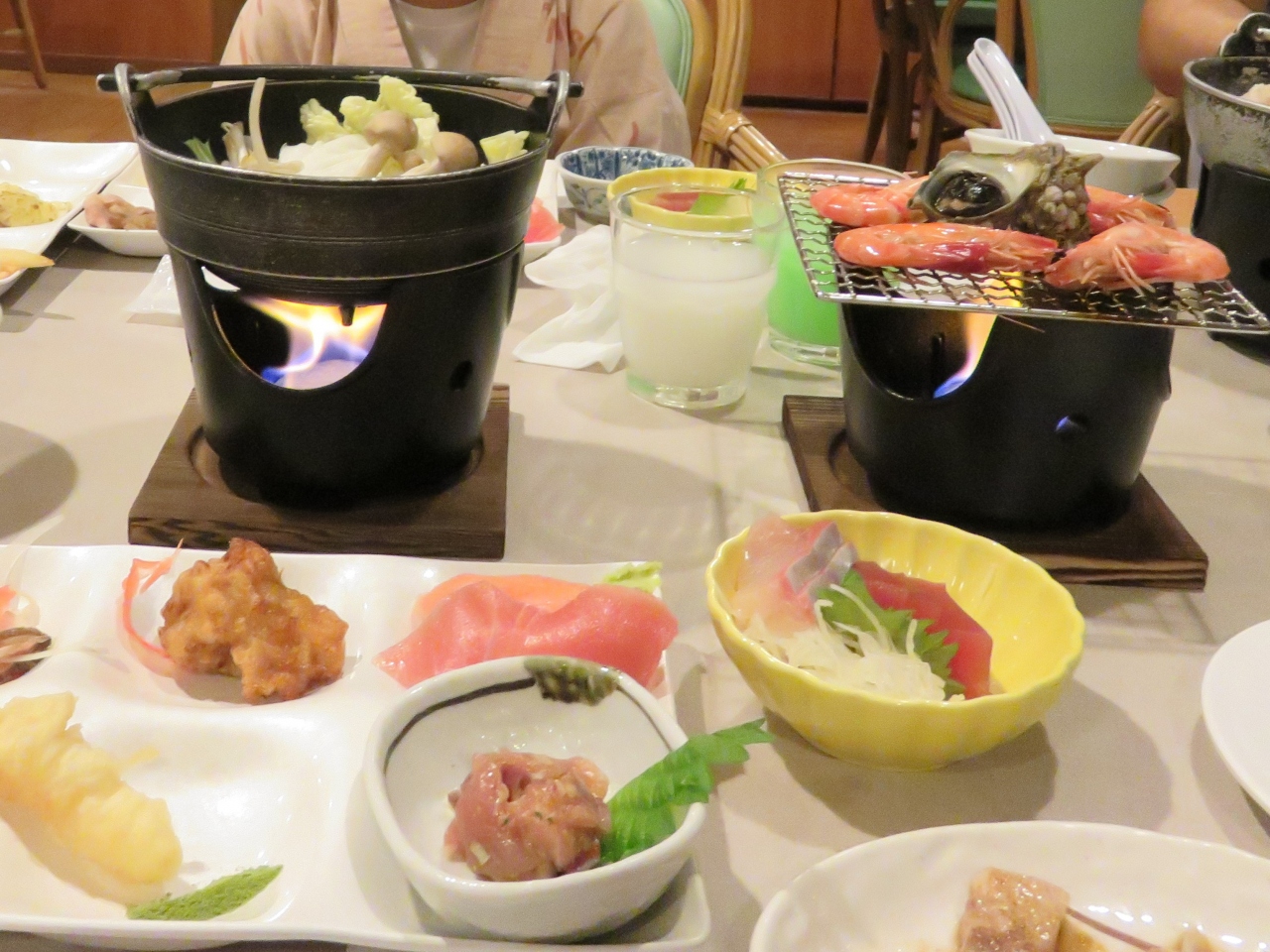 料金が安かったので期待はせず口コミの良い夕食を楽しみにしていきました。実際のバイキングは、テーブルで1人づつの網で海鮮を焼いたり鍋ができたりと種類が豊富でした。海老の天ぷらやお寿司、お刺身もあり、大満足です。大型ホテルではないので、宿泊者が多くないので、バイキングを取りにいくのも慌ただしくなくゆっくりと食べる事ができよかったです。