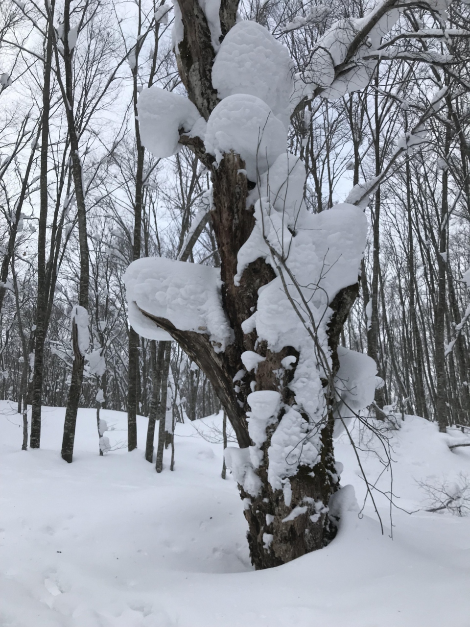 途中、高低差を利用して雪の滑り台を楽しんだり、樹齢数百年の大木に案内してくれ面白かった。