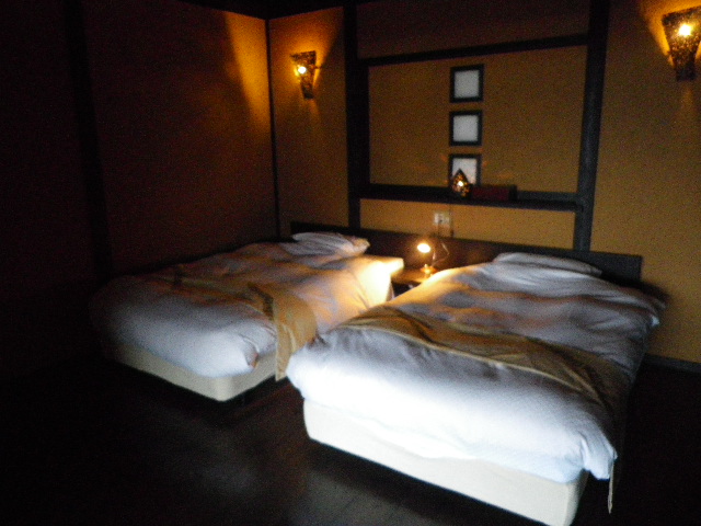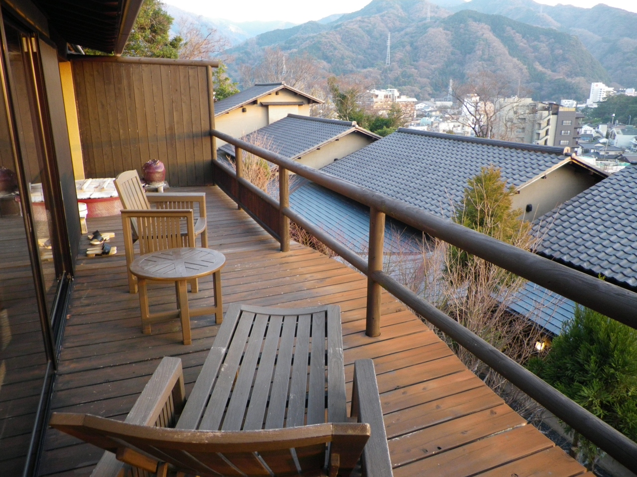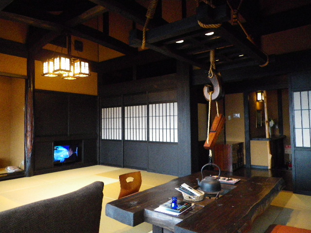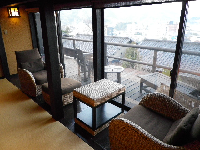 古民家風旅館は全室露天風呂付客室で駿河湾と土肥温泉街を見渡せる高台にあります。畳の部屋に囲炉裏のテーブル、寝心地良いやや硬めのツインベット、広いバルコニーに露天風呂、室内にシャワールーム、タオル類多め、作務衣、バジャマ、丹前などあり。珈琲紅茶マシーン、ミネラルウォーター、枇杷ゼリー無料。夕刊と朝食時に日経新聞あり。無料貸切り風呂2ヵ所に牛乳と珈琲牛乳。ロビーに無料の駄菓子と珈琲牛乳あり。部屋は居心地よく満足。美味しい夕食でしたがやや盛り付け等寂しい料理内容、朝食は満足。予約サイトより割引クーポン利用と直前割引で平日一人25000円、料金に見合う旅館でした。