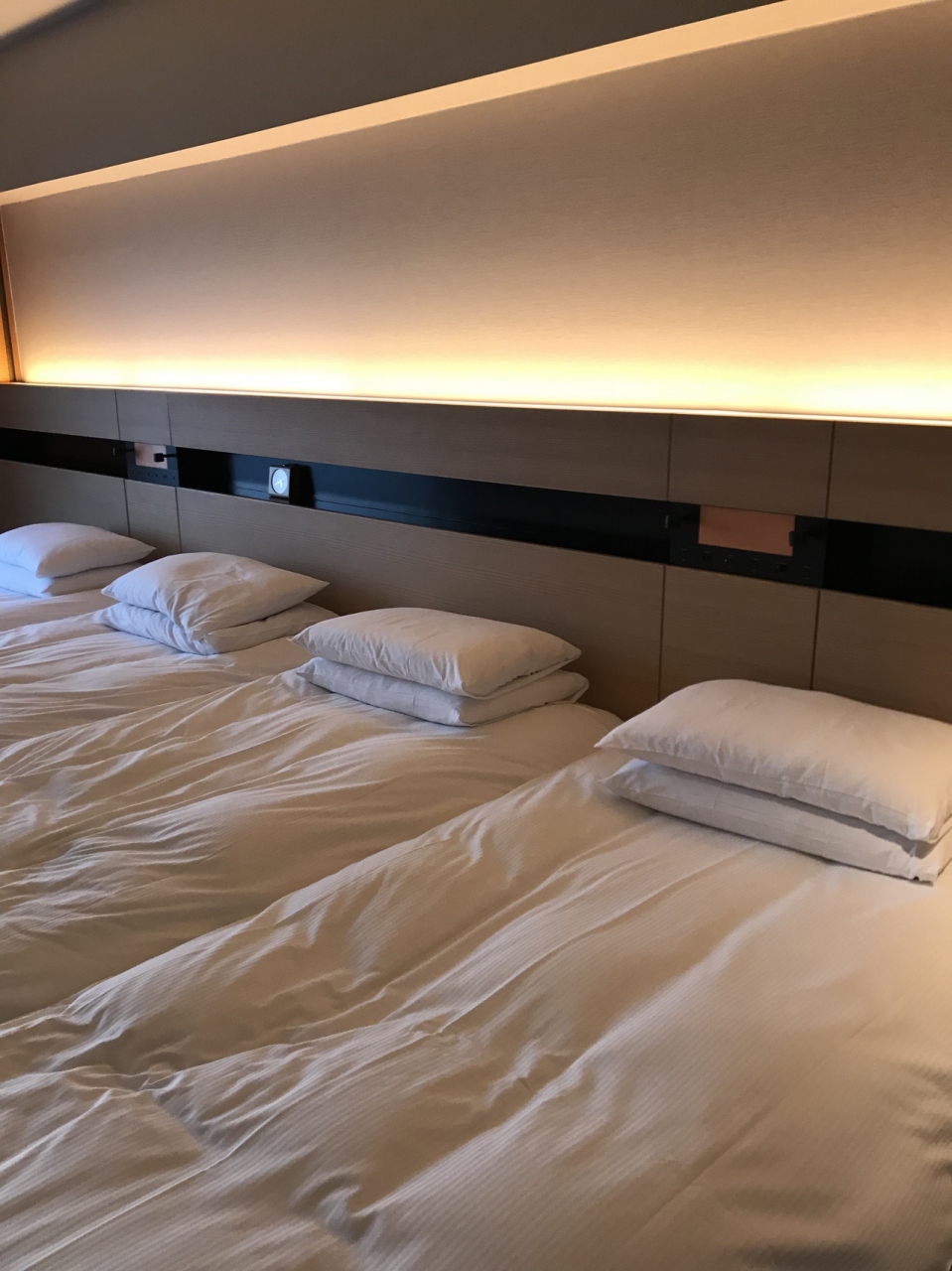 シングルベッド4台をくっつけてもらいました。なぜか中央寄りに合わせてあったので、欲を言えば壁にぴったりつけてもらいたかった。