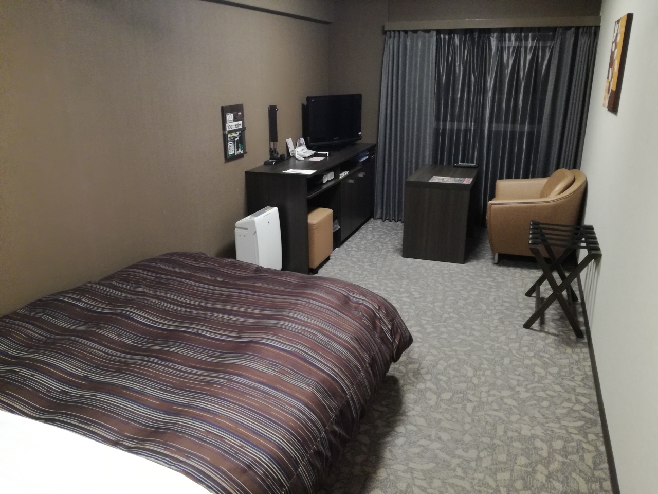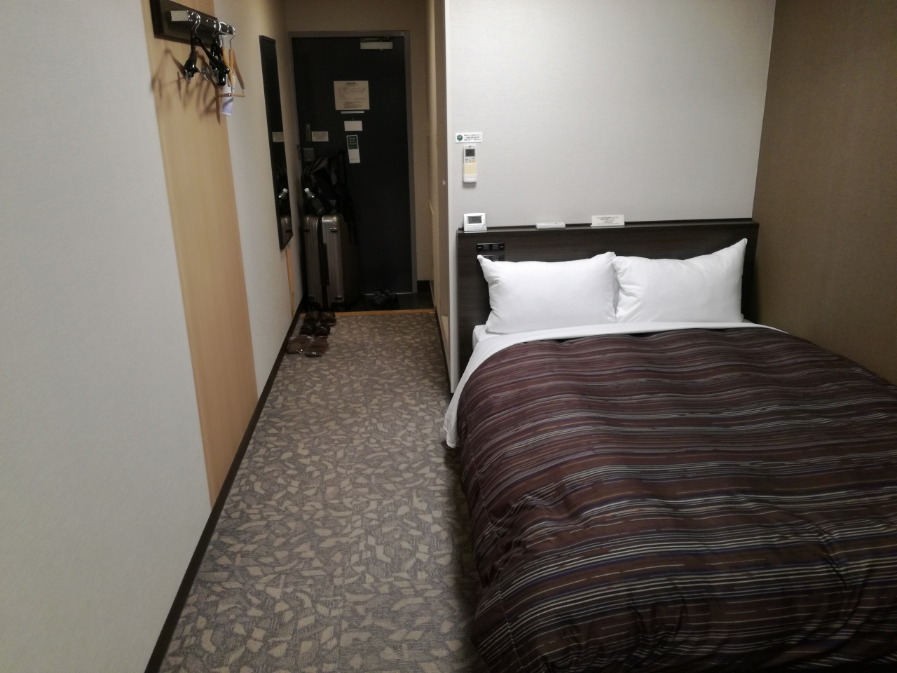 部屋はダブルルームなのでビジネスホテルとしては非常に広く快適です。大型のスーツケースを2つ広げても余裕があるスペースがありました。