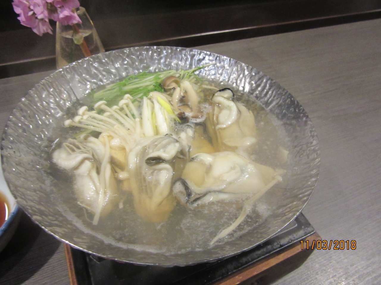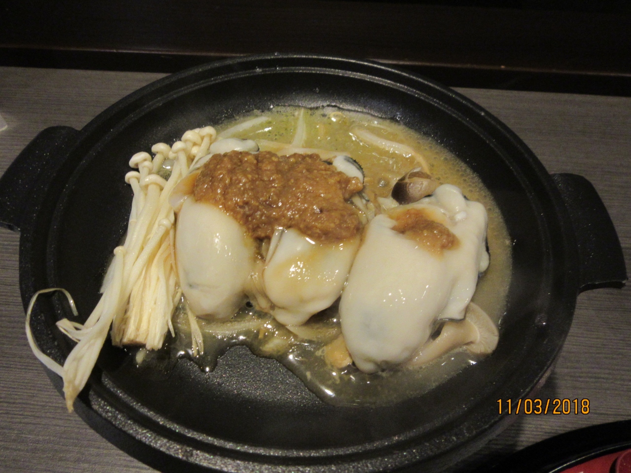 牡蠣は陶板焼き・羽二重焼き・ハリハリ鍋・牡蠣フライ・茶碗蒸し他でプリプリの牡蠣が合計で17個入っていて大満足であった。残ったご飯と漬物は部屋に持ち帰り頂いた。