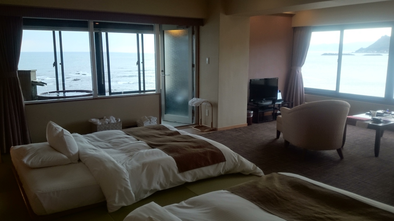 露天風呂付客室に宿泊しました。部屋の露天風呂は源泉かけ流しでとても温まりました。又、角部屋だったので眺めがとても良かったです。夜行われるロビーでのミニコンサートもとても楽しめました。今回はフルートとサックスでした。鮑・伊勢海老ももちろん美味しかったです。ラウンジでコーヒー・ハーブティーがいつでも頂けるのも良かったです。