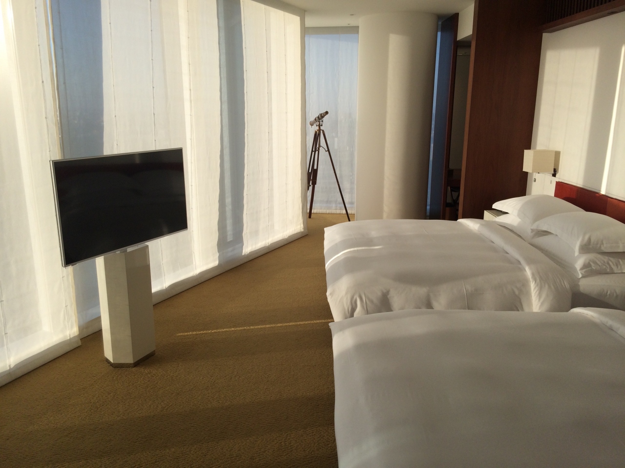 初めて宿泊しました。ワールドオブハイアットのグローバリストの特典でスイートにアップグレードしていただきました。景色は絶景で東京が一望できます。特にフィットネスセンターからの景色は快適でした。ロビー階のラウンジも自由に使え快適でした。