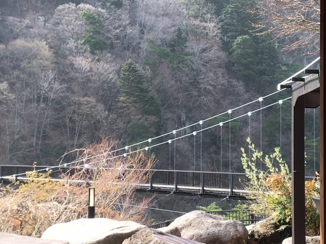 ホテルの横につり橋があり、そこからの眺めが最高です。つり橋ですから、揺れます。橋の途中で景色を楽しんだり、渡り切って展望台にも行きました。途中トンネルがあって、短いのですが、一人では入りたくないなぁと思いました。入る時は先が見えないので、不安になりましたが、帰るときはすぐに出口が見えて不思議でした。