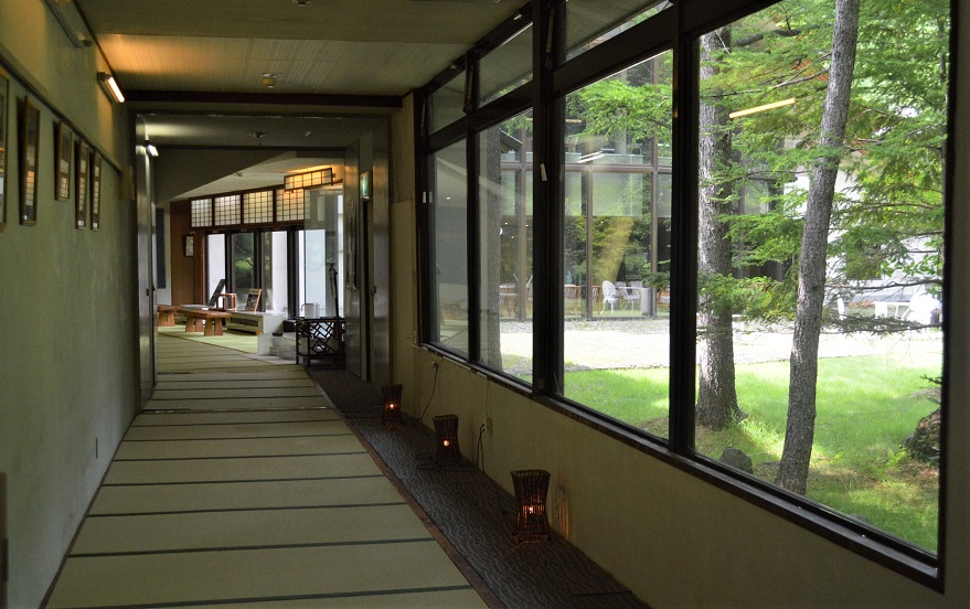 畳敷きの廊下の先にあるのは大きな木造棟で丸太組みの天井もその渋い雰囲気が良い。