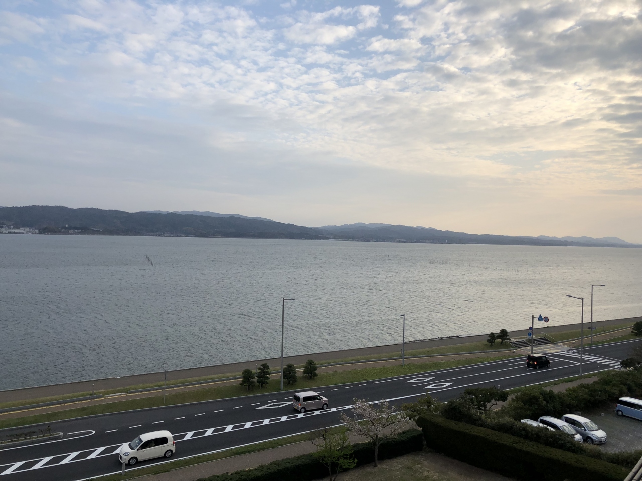 客室の窓からは宍道湖が見え、あいにく天気が悪かったのですが朝にしじみ漁をしているのが見えました。
