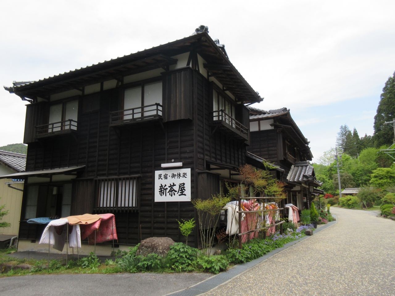 馬籠バス停から狭い曲がりくねった道を2kmほど南に行った、旧中山道沿いに建つ一軒宿です。すぐ隣には江戸時代の一里塚がひっそりと残っています。バスでも行くことは可能ですが、本数は大変少ないので、車か徒歩で行くしかありません。民宿の先へは車も進むことができません。そんな静かな山間に建つ民宿です。最近は車で行ける便利な所に建つ宿泊施設がほとんどですが、車も先に進めない宿に泊まり、山道を上り、峠を越え、宿場から宿場へ歩いて移動することで、江戸時代の旅人の思いに触れることができました。