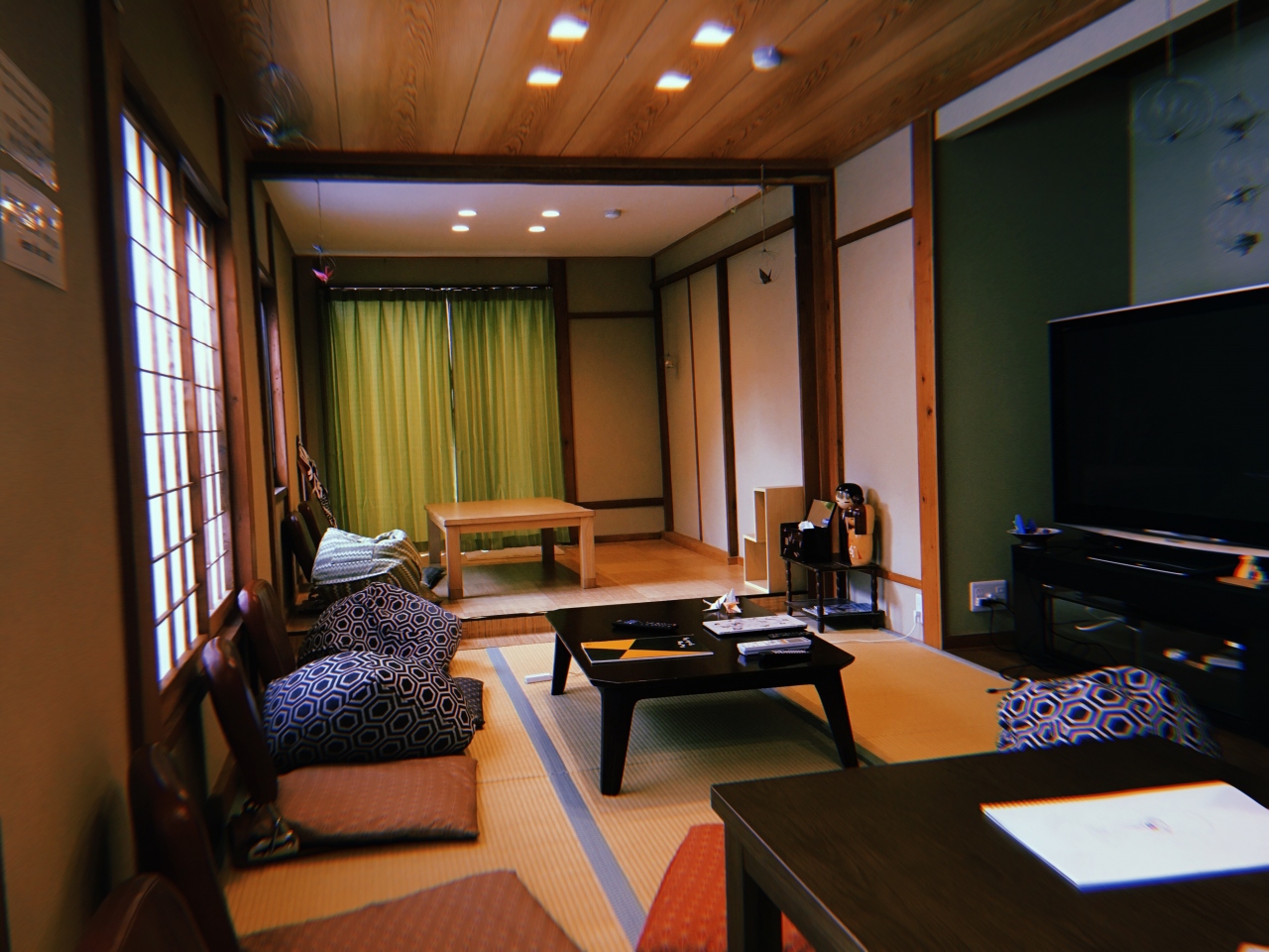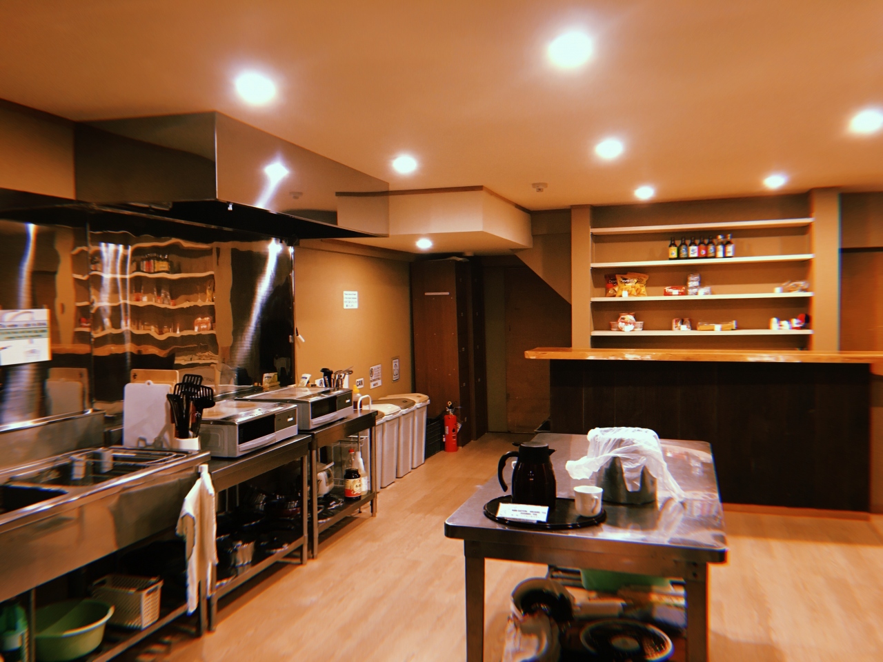 元旅館なので、中は広々していて過ごしやすく綺麗に改装されています。リビングにはTVあり。広いキッチンでパン、シリアル、コーヒー等は無料。