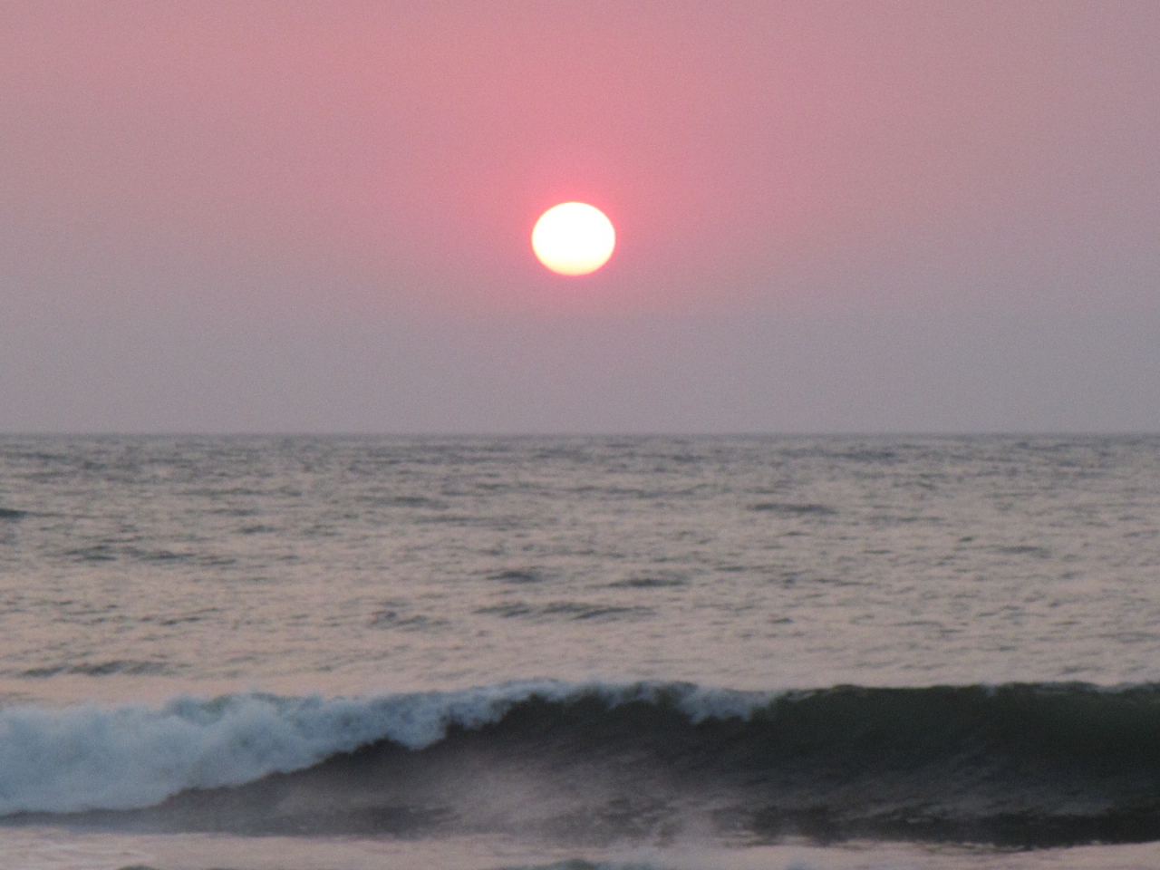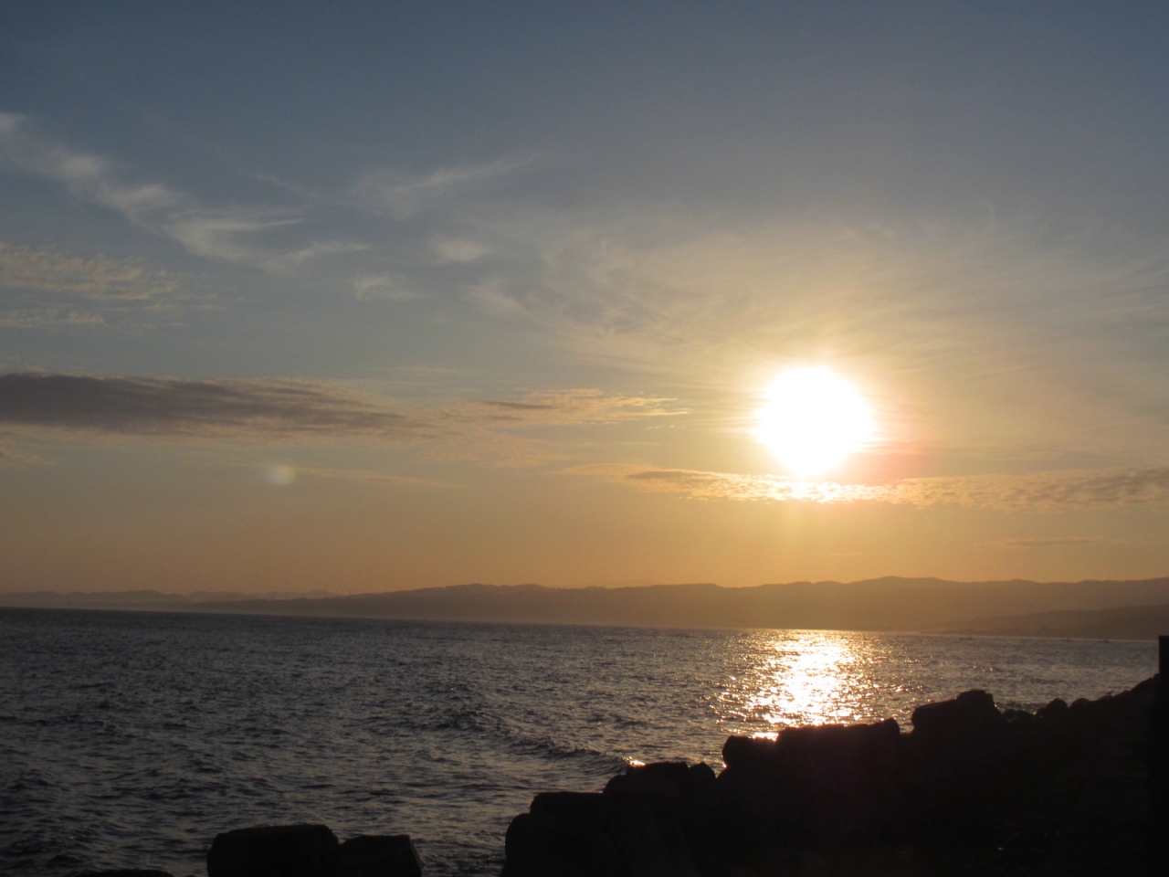 宿の前の防波堤に座って抒情的な日没の風景を眺めました。
