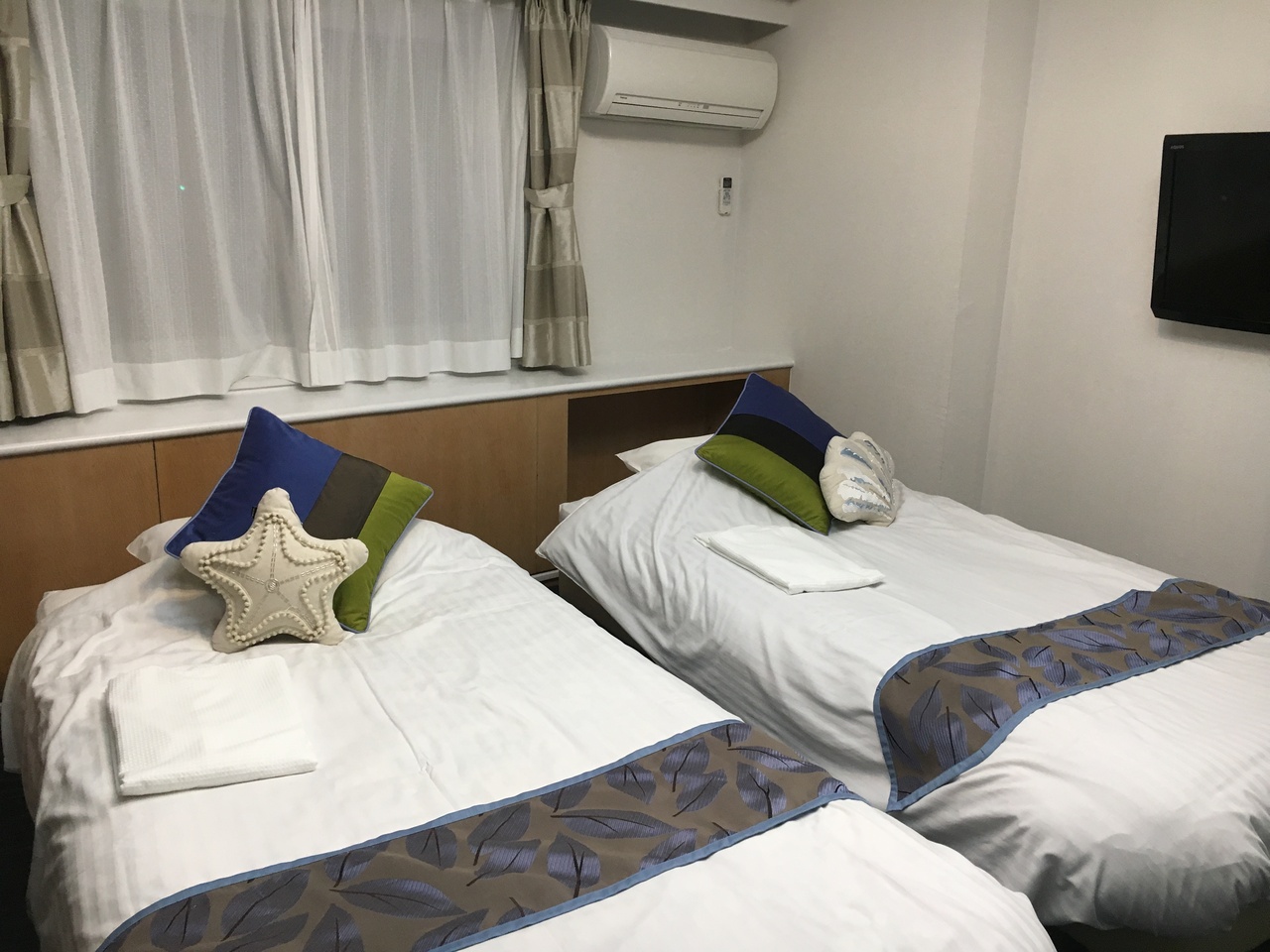 ベッドに1つずつ海っぽいクッションがあり可愛かったです。