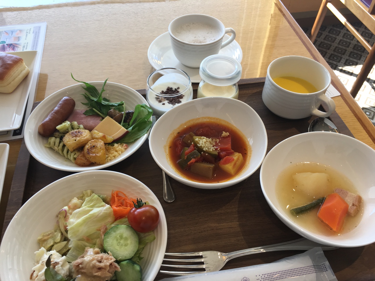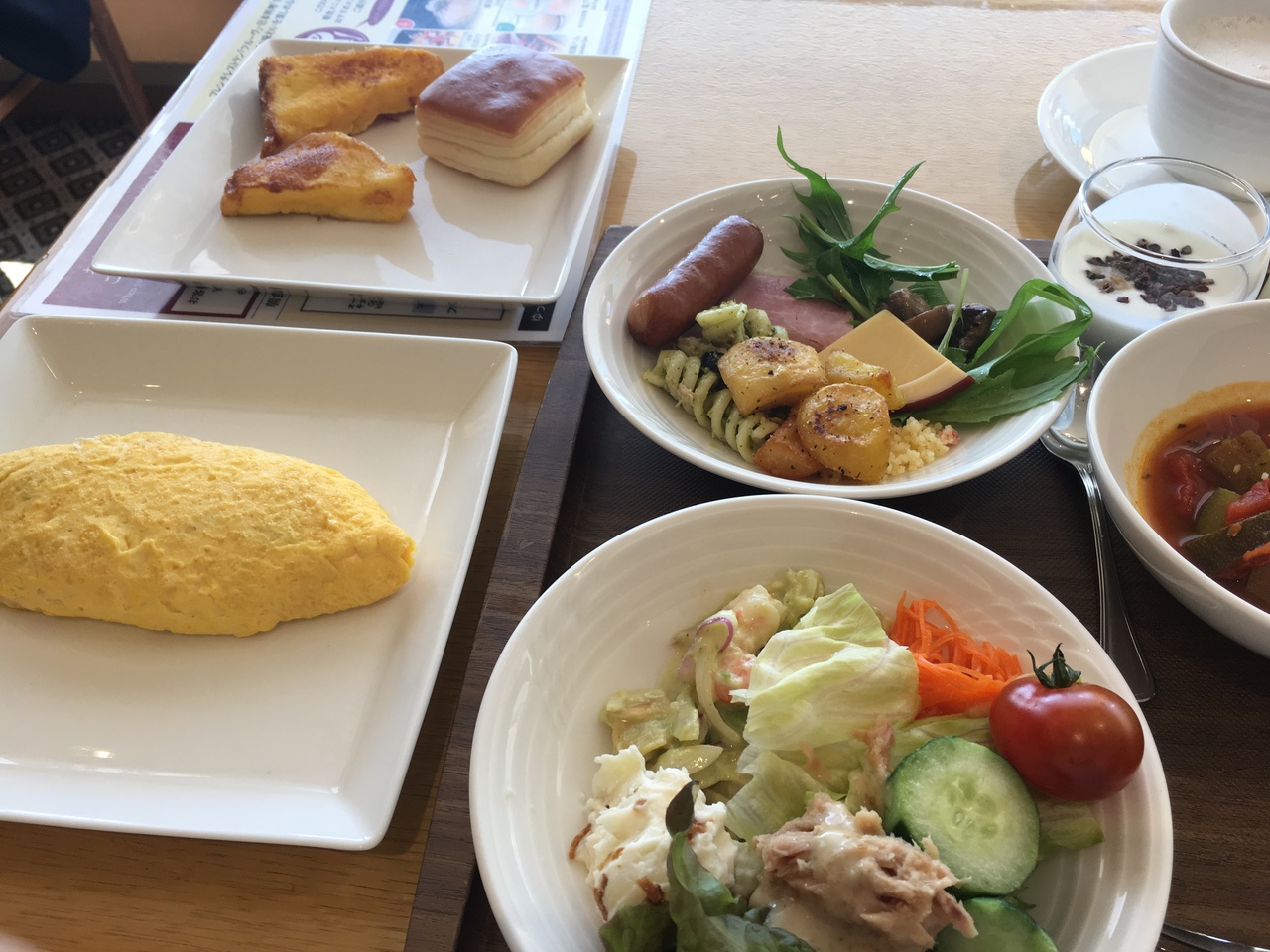 シェフが目の前で作ってくれるオムレツは自分で具を選び、和風または洋風(生クリーム入)に作ってもらえます。オムレツの横にはフレンチトーストや、数種類のパンがあり、目移りしてしまいます。他には野菜たっぷりのポトフやスープカレー、自家製プリン、スーパーフード入りのヨーグルト、数種類の果物などがありました。