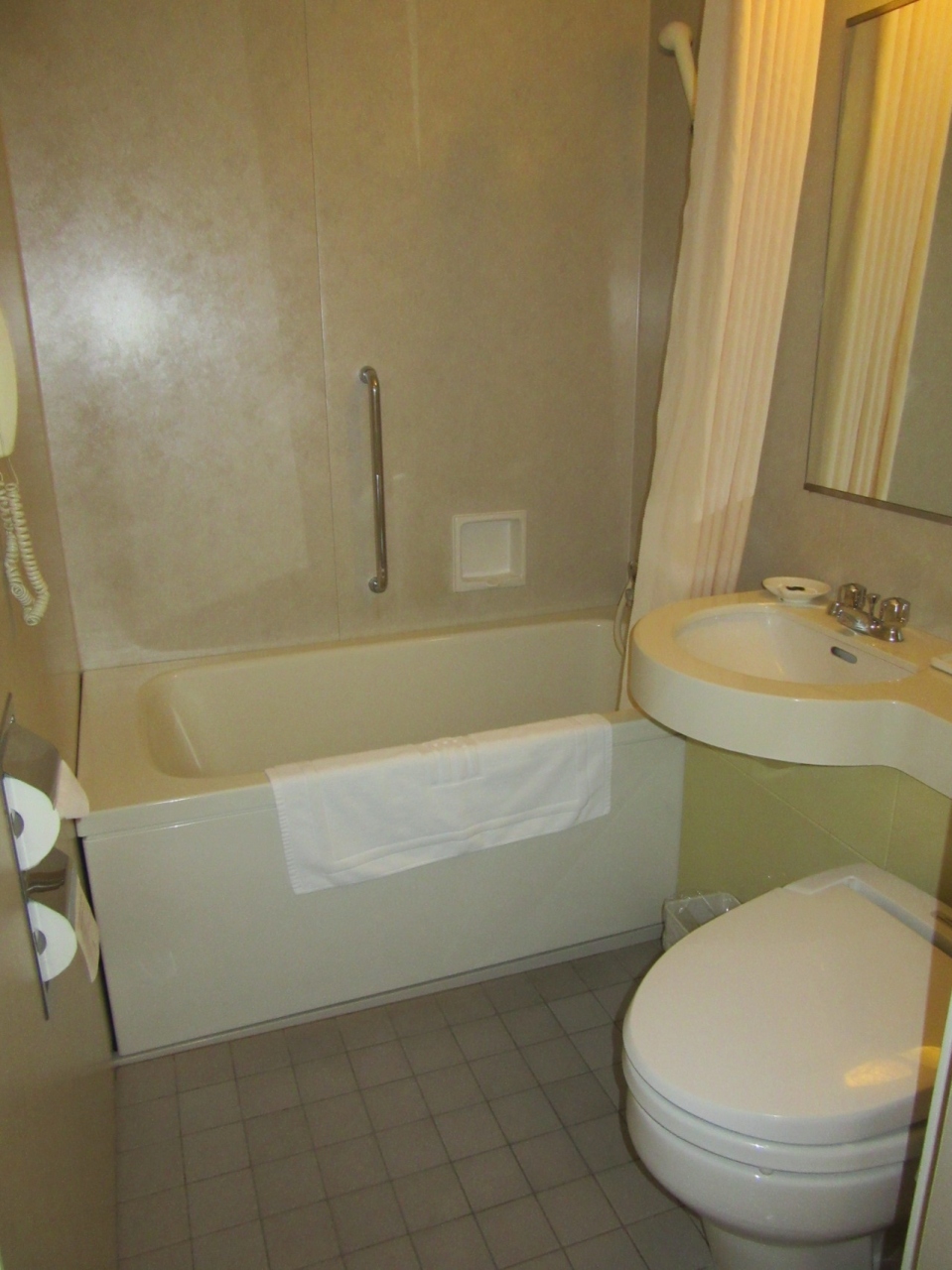 部屋は狭いながらも明るく清潔感がありました。シャンプー、リンス、ボディソープ、歯ブラシ、綿棒、くし、パナソニック製のナノイーのドライヤー、深めのバスタブ、タオルは大中小の三種類、冷蔵庫、電気ケトル、空気清浄機あり。