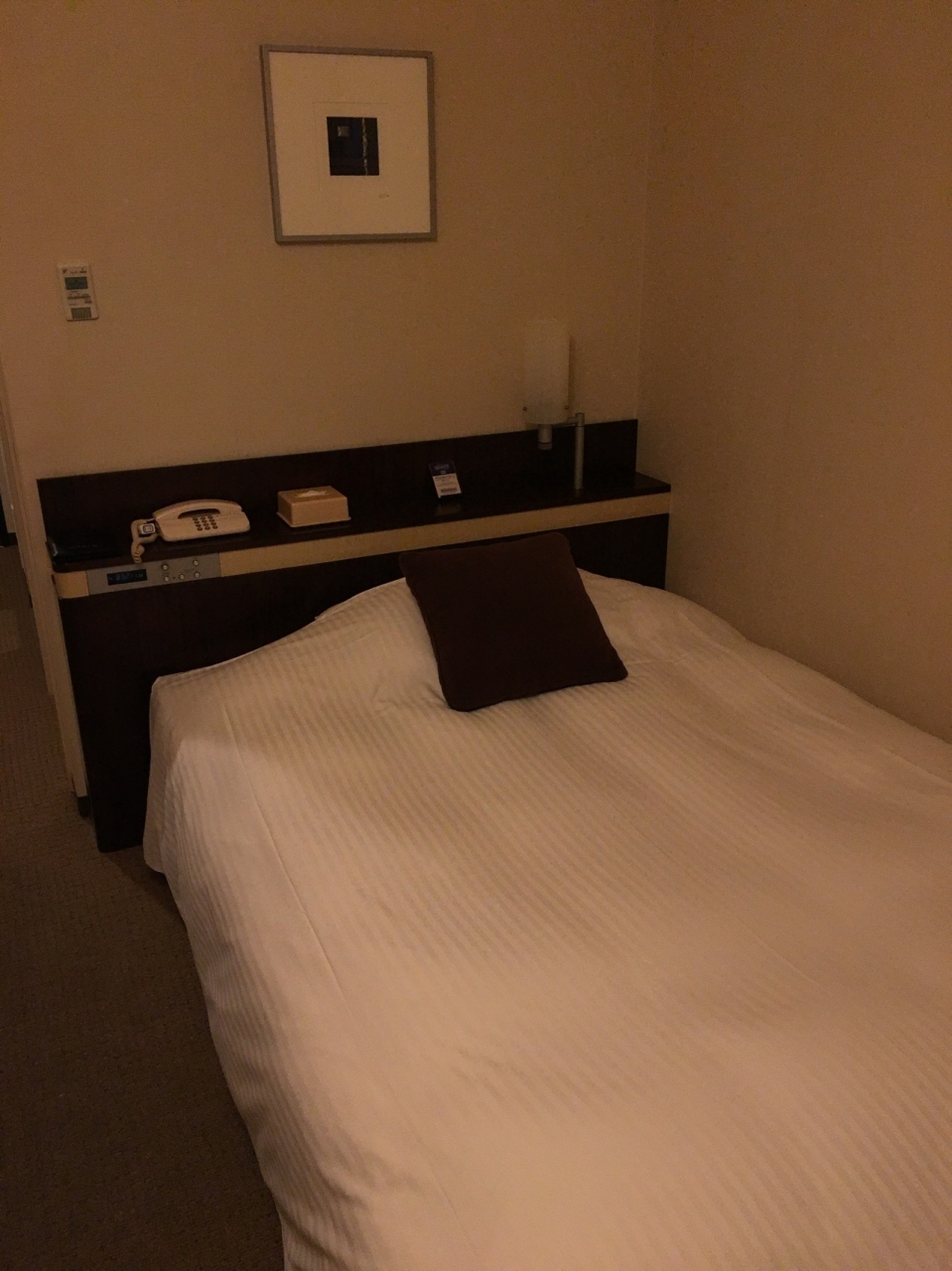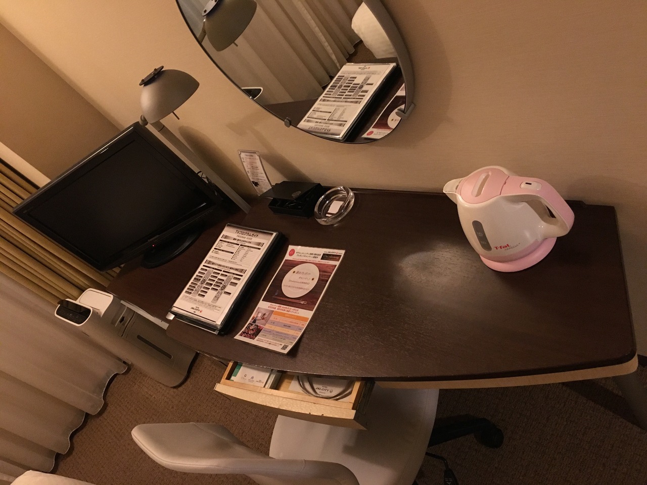 宮崎の繁華街ニシタチまでは徒歩圏内。部屋は広くはないが清潔。浴室も同じ。ベッドはシモンズ。デスクは長方形ではなく片側が曲線になっているのです、その分ベッドとの間が広いイメージ。電源はデスク、ベッド、窓の所と、あってほしいところにちゃんとある。製氷機は各階に設置されていて、部屋からアイスペールを持って行って入れる。普通に良いホテル。