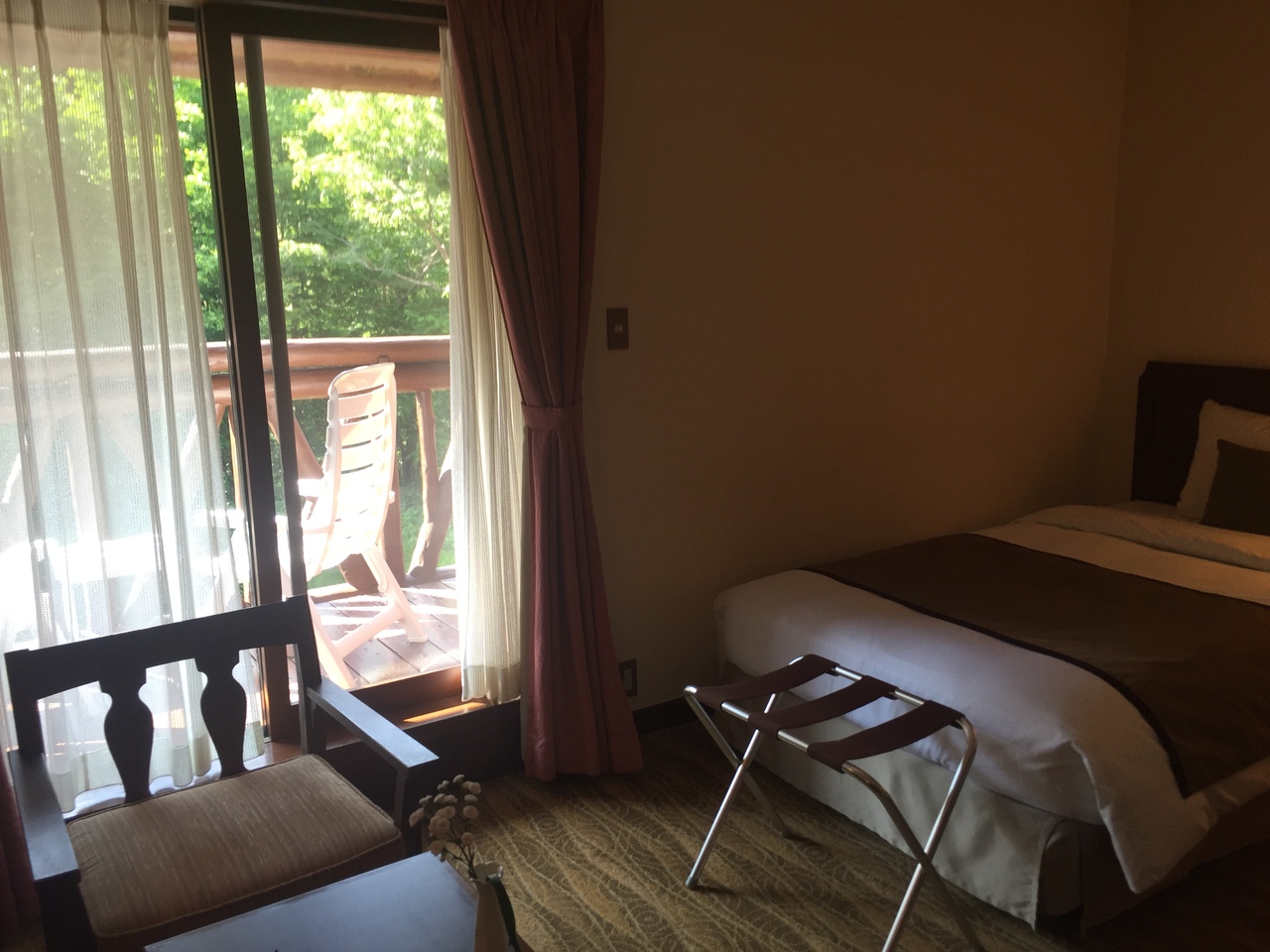 緑の中に映える赤い屋根の美しい建物がなんとも印象的です。こんな自然の中にこんなに素敵なホテルがあるなんてとワクワクしました。梅雨のこの時期なのに運良くお天気にも恵まれ、部屋のベランダからは穂高が望めました。エアコンがないので昼間少し暑いぐらいでしたが、窓を開けると心地よい風が入ってきます。食事も大変美味しくいただきました。