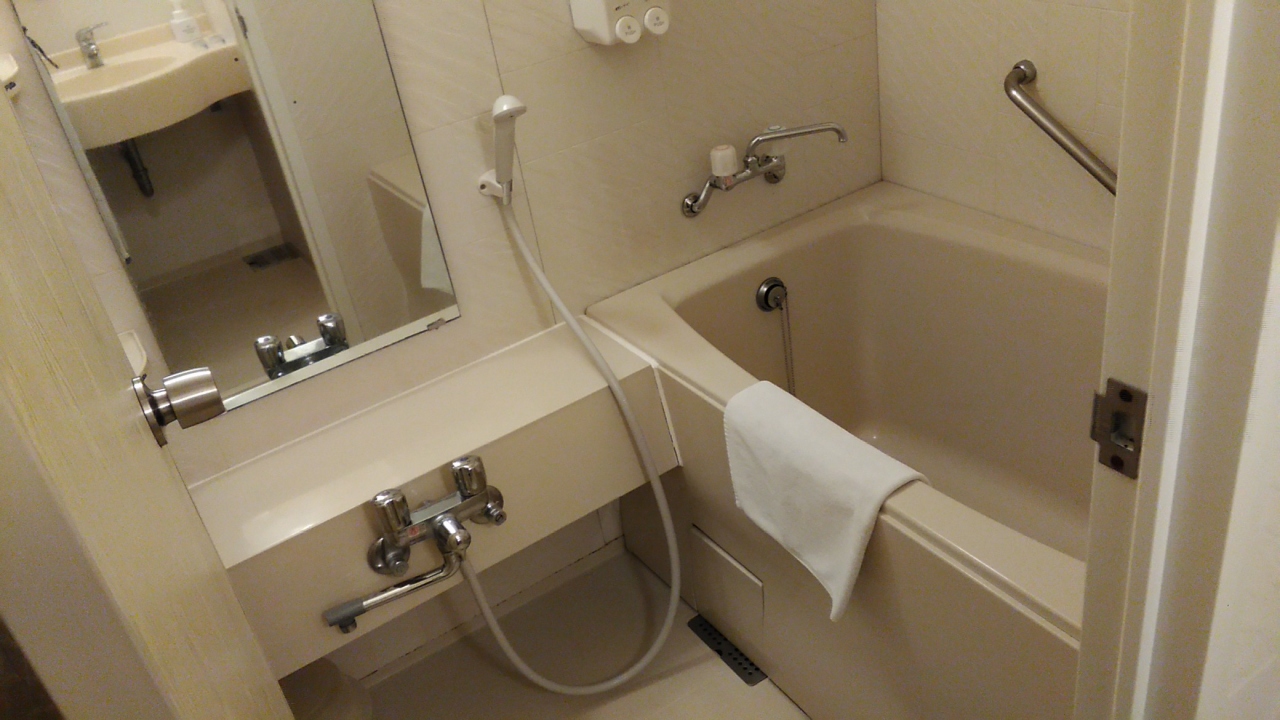 台風で帰る予定の飛行機が欠航して、その日のうちに帰れそうになくて急遽泊まることになったホテルでしたが、ベットはセミダブル?、風呂、トイレ、洗面台は分かれているので使いやすい広い部屋でした。