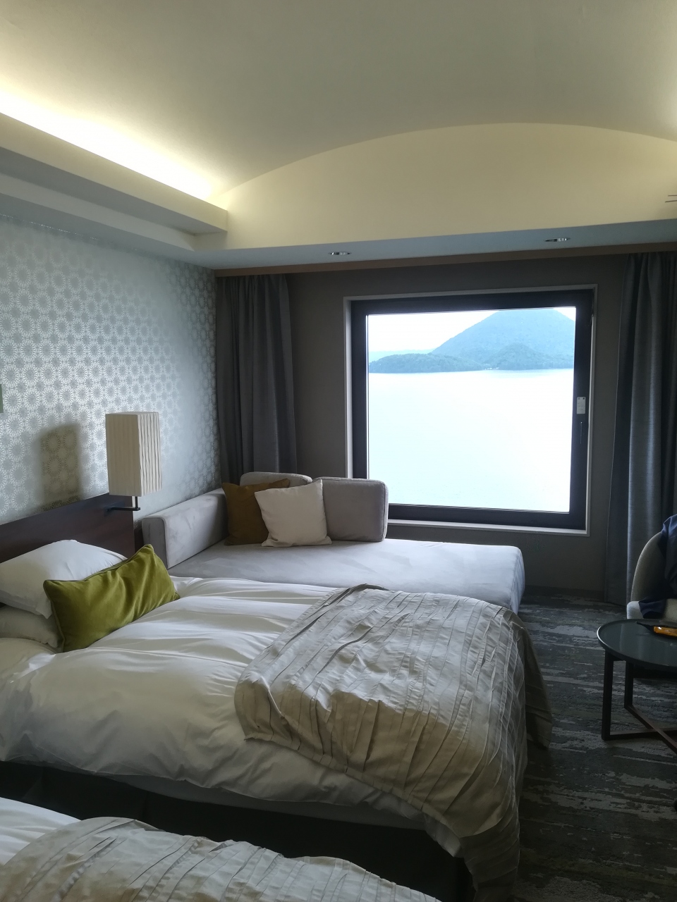 湖の真ん前にある大きなホテル、フロントロビーはとても大きなガラス張りになっていて、正面には洞爺湖が綺麗でまるで絵のようです。部屋は10階でリフォームされていてきれいですが、狭かったです。ここからも洞爺湖が見渡せ、夜になると花火大会が毎日開催されていて、よく見えました。お風呂は地下1階の大浴場とその前にはりだした露天風呂、ここも洞爺湖が一望出来ます。食事はバイキング、品数豊富です。ここからは景色は見えませんでした。
