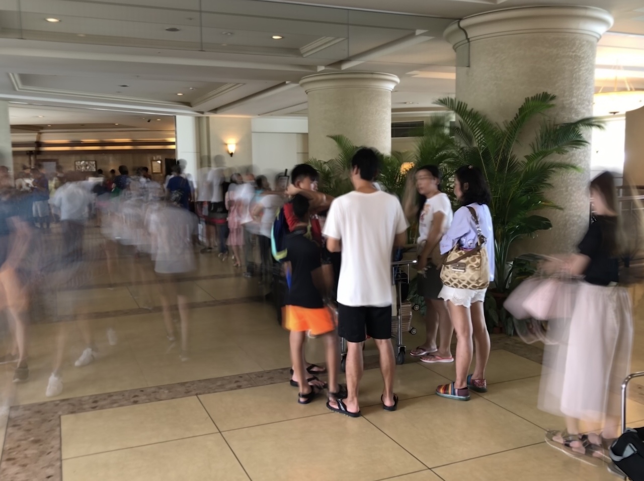 10年程ぶりに宿泊しました。台風10号ど真ん中で、ホテルの外に行けないのか、11時のチェックアウトの際には、部屋から出ても、エレベーター待ちに15分、2Fフロントチェックアウトカウンターは長蛇の列。中央入り口を過ぎて約30-40mビックです。天気の悪い日は早めのチェックをオススメします。朝食券も11:30-ランチ券として使えますが、11:15位にはレストラン前に長蛇の列でした。