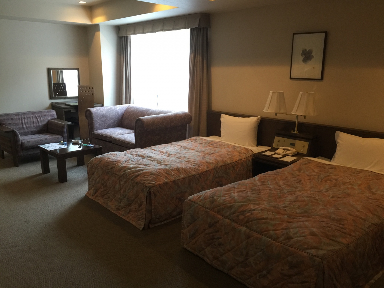 部屋は多分このホテルの中で1番狭い部屋だと思いますが、それでも2人なら充分な広さもあり、お風呂は使用していませんが洗い場付きで広め、トイレも個室で、部屋は眺めは悪かったですが(喫煙室を希望したためか)満足です。