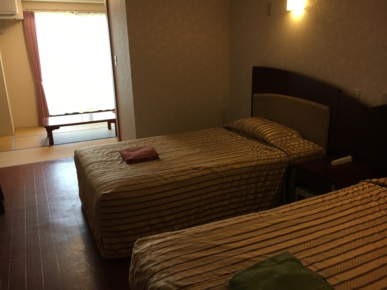 部屋は和洋室で広くて快適。フロントでチケットをもらい隣の建物の温泉に入ります。温泉は基本的に日帰り施設なので朝は営業してないけど11時から入れるのでチェックアウト後にチケットをもらい、海水浴帰りに入りました。朝ごはんのブッフェはセルフでタコライスも作れて美味しいです。夕食が無いのが残念。近くにはコンビニしかない。フロントには電子レンジがあるので買ってくるか、少し遠いけど外食ですね。