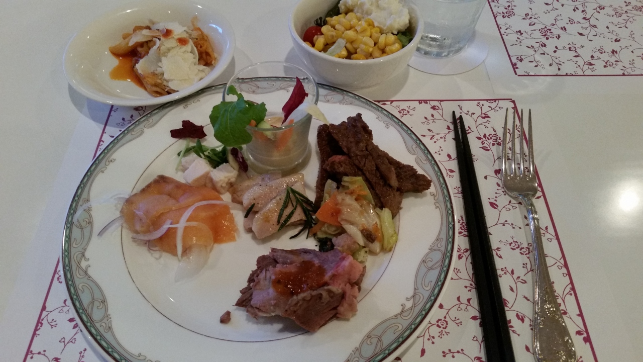 サラダバーがあり、取り放題。他にビスケット、飲み物など、いろいろありました。パスタは、驚くほど大きな皿に盛り付けられてでてきました。味もおいしかったです。通路は... もっと見る