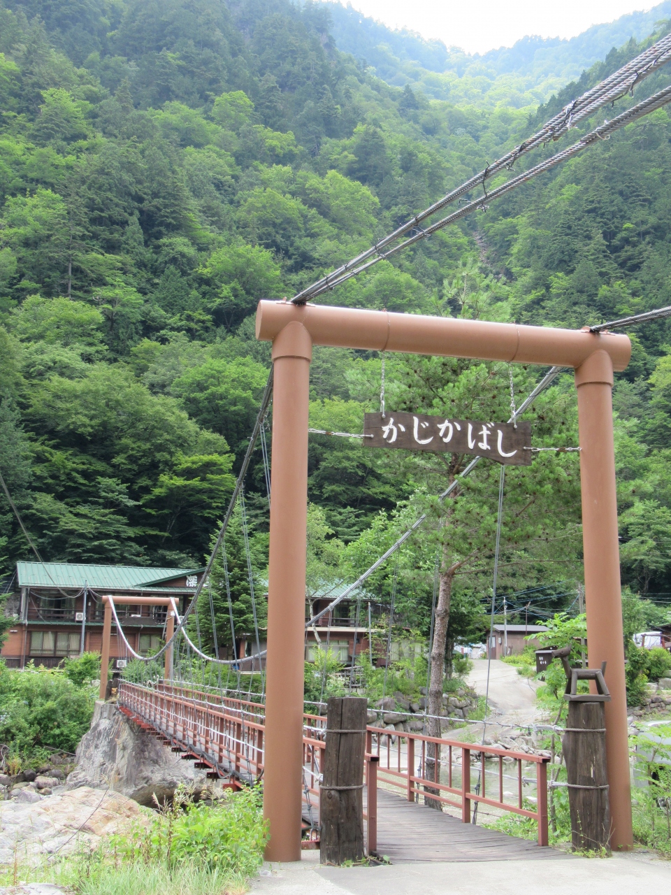 宿泊者は無料で湯浴み着も貸して貰えますが、吊橋や対岸の「登山者駐車場」からも丸見えです。
