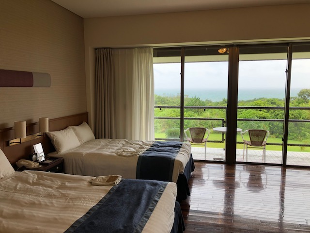 - 棟によるが、2階の部屋から海が見える。広めで落ち着いた色のファブリック。古さは否めないが、手入れはされている。