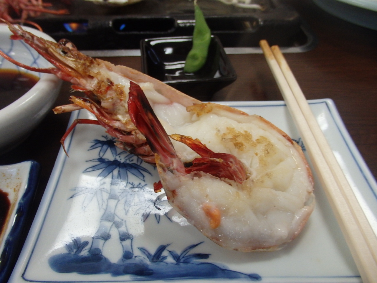 食事は、2階の座敷で、楽しみにしていたバーベキューでした。伊勢エビの他にホタテもあり、新鮮でおいしかったです。おさしみもついていたので、じっくり味わいました。朝食も焼き魚のついた和食でくつろぎながらいただきました。