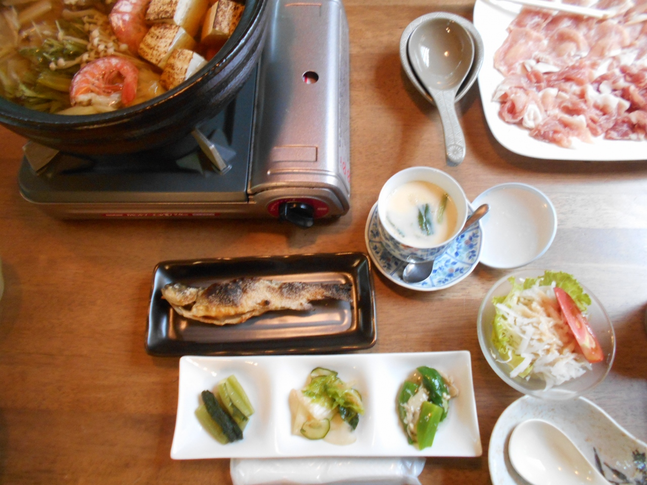 食事は山小屋よりも旅館に近く、ボリュ-ムも満点。1泊目はメインが焼肉バーベキュー、2泊目のメインはきのこ鍋の豚シャブで、それに岩魚の塩焼き、味噌汁などが付く。メイン料理の焼き加減や煮加減は自分で好みにできるので、一番美味しいタイミングで食せる。(写真参照)