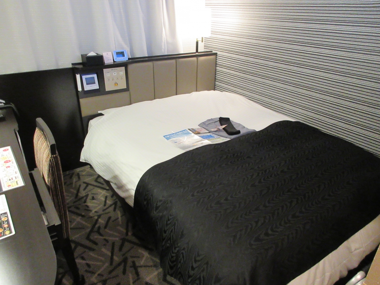 ☆9m2の部屋に142cm幅のベッドが置いてあるので,その他のスペースはほぼありません.椅子を引くと直ぐにベッドにぶつかる感じです.その一方で,大浴場があったり,TV画面がやたらに大きかったりと,部屋の狭さをその他の機能で補っている感じです.寝ることだけに特化するのであればこれでも十分かと思いますが,それ以上の目的がある場合には,別のホテルに変えた方が良いと思います.