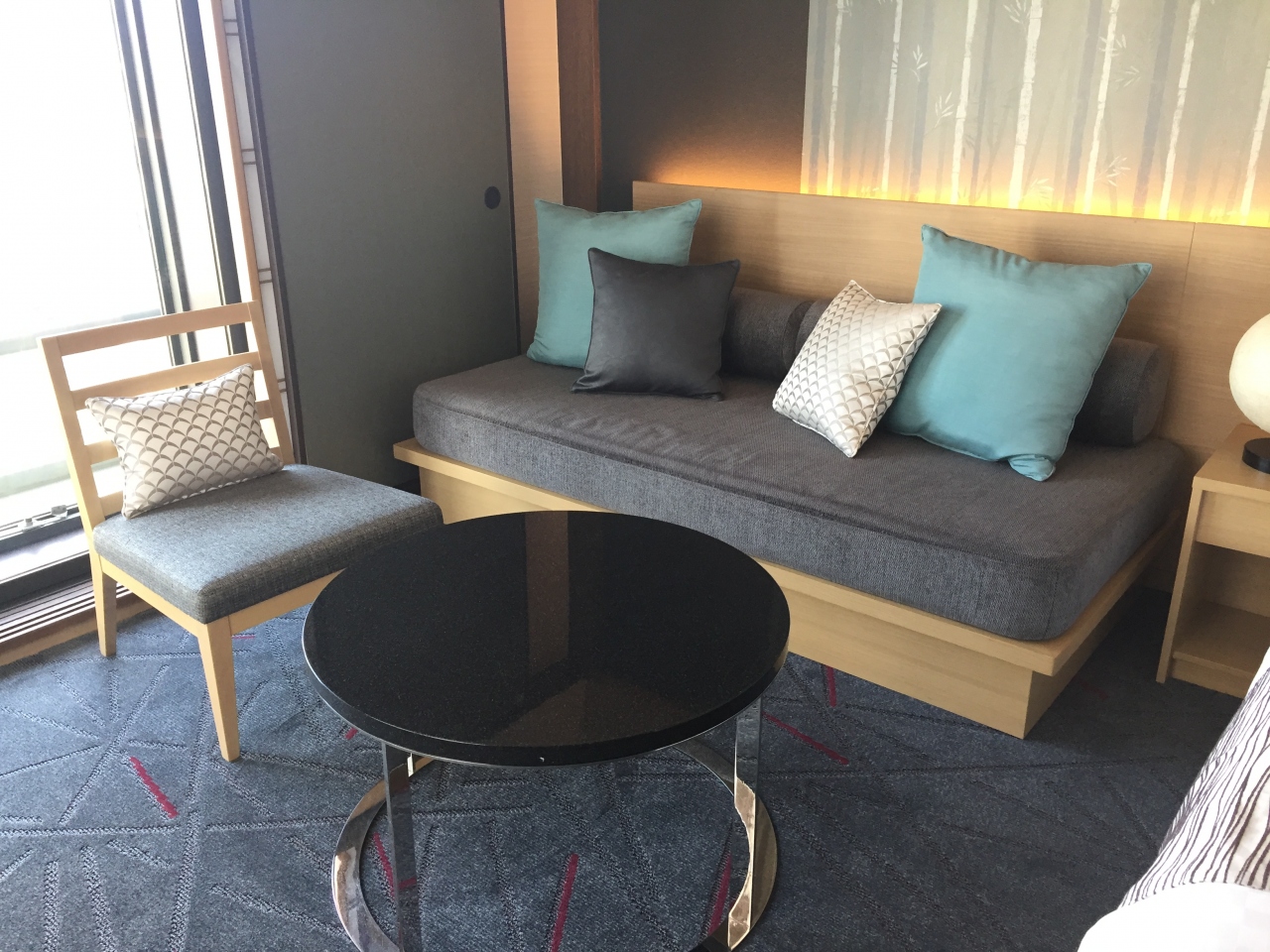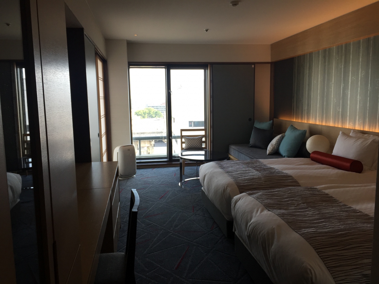 2方面に窓のある角部屋で、カーテンではなく、光を取り込む障子と、光を遮るふすまを模した窓周りが和でステキ。新幹線ビューでした。