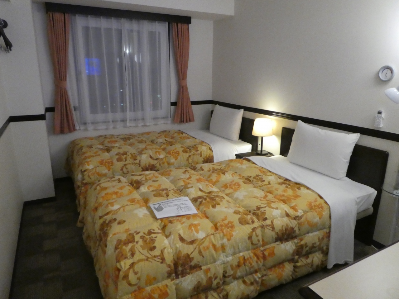 愛媛県新居浜市の新居浜駅前にあるビジネスホテル。駅のそばのホテルはここだけです。室内はシンプルで必要最低限のものは揃っています。受付の隣に寝巻きや髭剃りがあり、必要に応じてここから部屋に持って行くシステムです。この時はツインをシングルユースしましたが、2人で利用したら狭いかも。