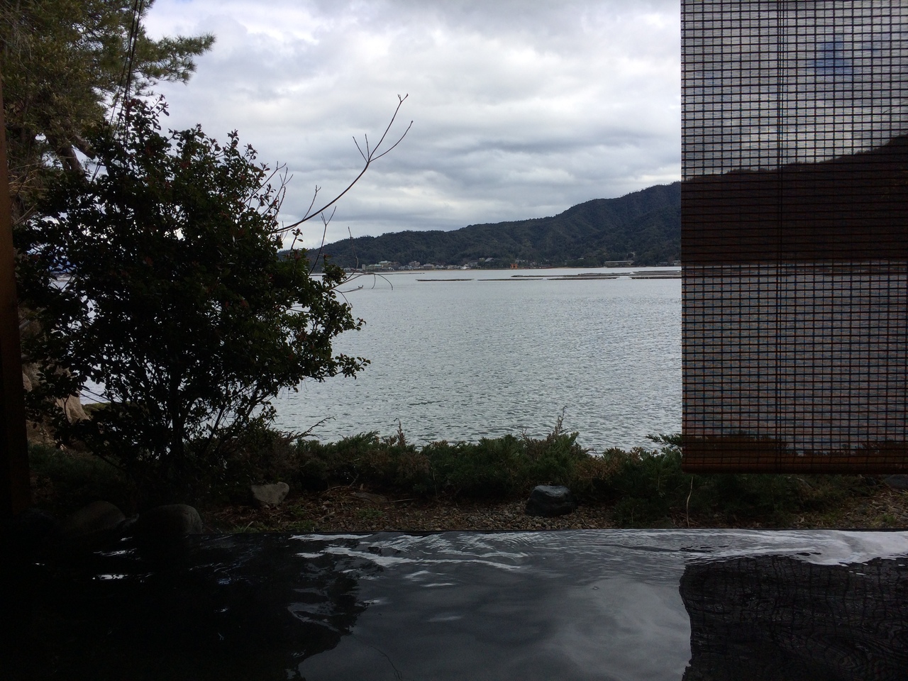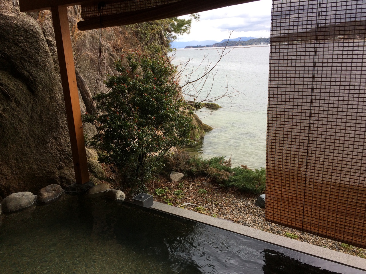 脱衣スペースもかなりのゆとりがあり、肝心の貸切風呂からの眺めはこれまた素晴らしい。宮島の大鳥居も見えます。