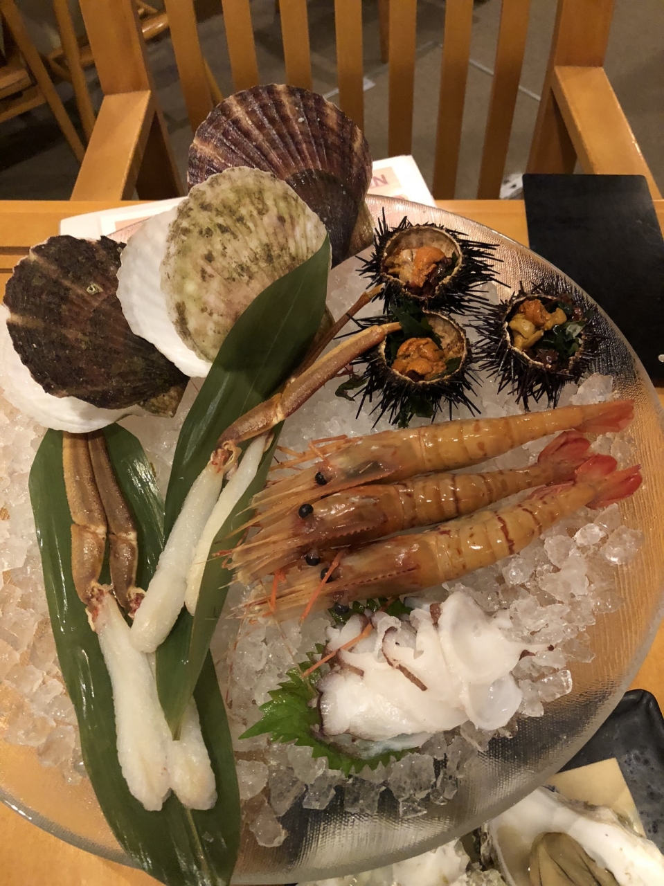 夕飯は、海鮮盛り合わせ付きバイキングでした。海鮮は、チェックインの時に、苦手なものをきいてくれます。私たちは、生牡蠣が苦手というと、1人は、焼いた牡蠣、もうひとりは、カニの刺身に変更されました。でもこのカニは、ちよっとしょっぱ過ぎでした。