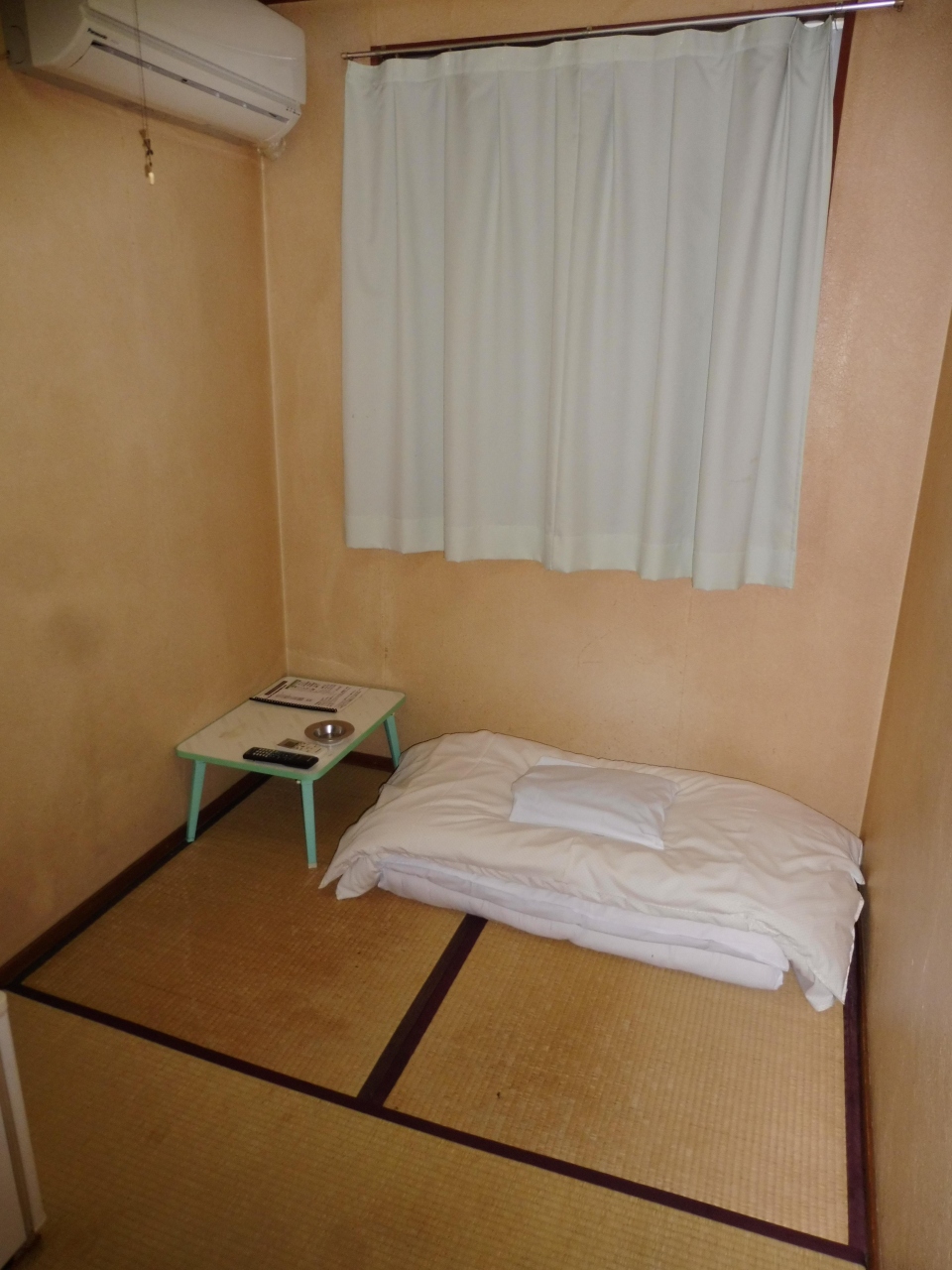 3畳ほどの和室の布団は自分で引く形でTVに小さなテーブルが設置されているシングルルームになります。