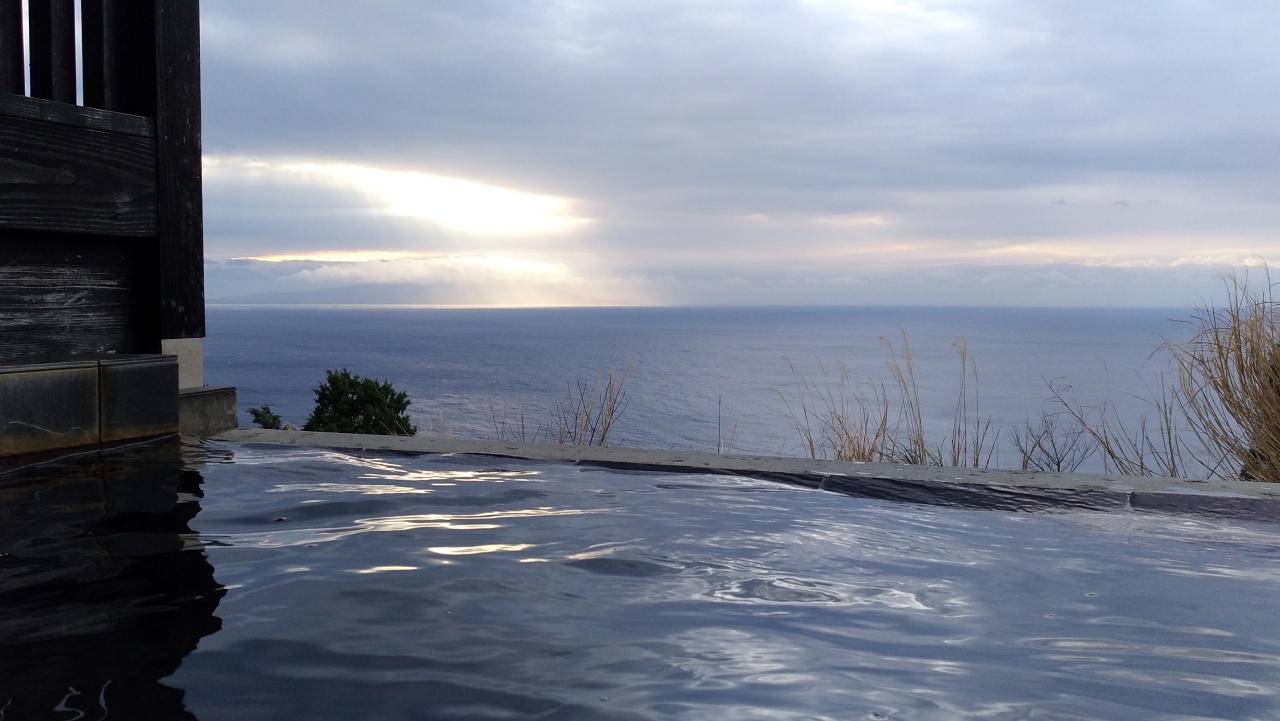 仕事の疲れを癒すために旅行を決定。貸切露天風呂がある宿をいくつか探している中、こちらを見つける。お風呂から海を見渡せて、プライベートでいつまでも入っていられ、施設がきれいという条件で探した。現地で見た光景はまさにイメージ通りで心身の疲れを癒すことができた。朝は水平線から太陽がのぼる位置をみれるがあいにく水平線上に雲がありきれいには見れなかった。テレビもおいてあるが、温泉、食事、温泉、就寝、温泉といった感じでまったく不要。それくらい施設がよかった。今回は車で行ったが電車でも送迎があるので可能な模様。