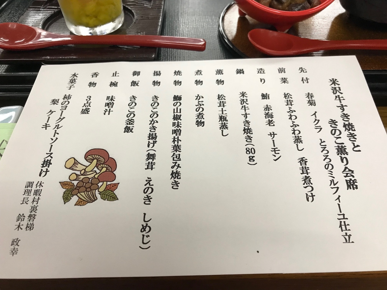 「米沢牛すき焼きときのこ薫り会席」はとろけるような米沢牛に、松茸の土瓶蒸しなど、質量ともに満足できる内容でした。